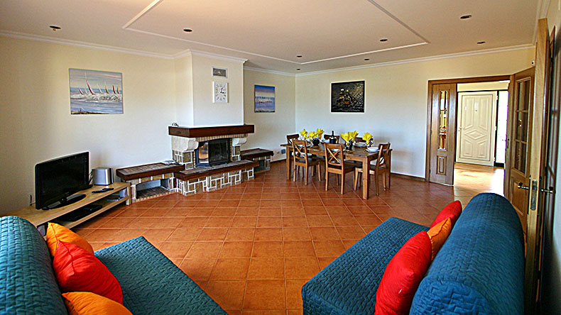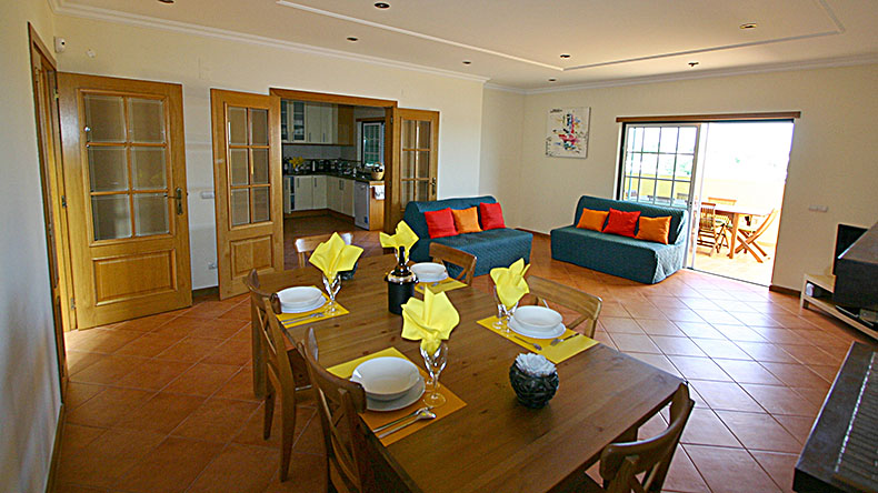 - un salon très spacieux avec cheminée, grande table, 8 chaises et canapé-lit convertible pouvant accueillir 1-2 personnes en supplément, l'ensemble plein sud donnant sur une très grande terrasse courant d'est en ouest.