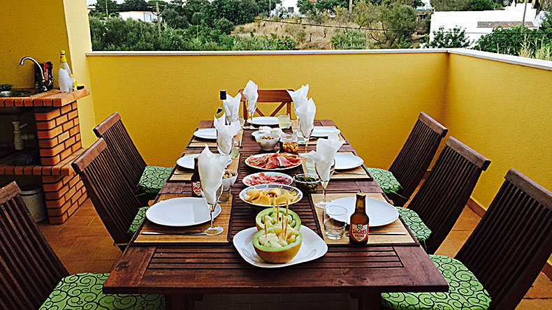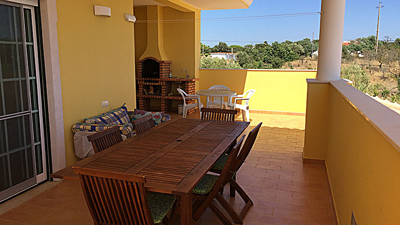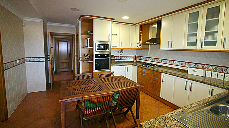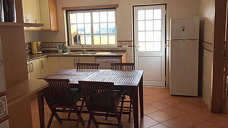 - une grande cuisine entièrement équipée avec table, 8 chaises, lave-vaisselle, réfrigérateur, four, micro-ondes, grille-pain, machine à café, bouilloire, vaisselle et couverts pour 8-10 personnes, l’ensemble plein sud donnant sur une très grande terrasse courant d’est en ouest avec BBQ et évier.